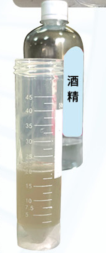 6.将20毫升洋葱汁液倒入试管中,并倒入等体积(20毫升)的酒精,静置一会儿。注意,这里使用的是在冰箱里冷藏过的、浓度为95%的酒精。这是因为DNA溶于水,但不溶于酒精。酒精浓度越高,沉淀出的DNA就越多。使用冷藏过的酒精,也是为了沉淀出更多的DNA。