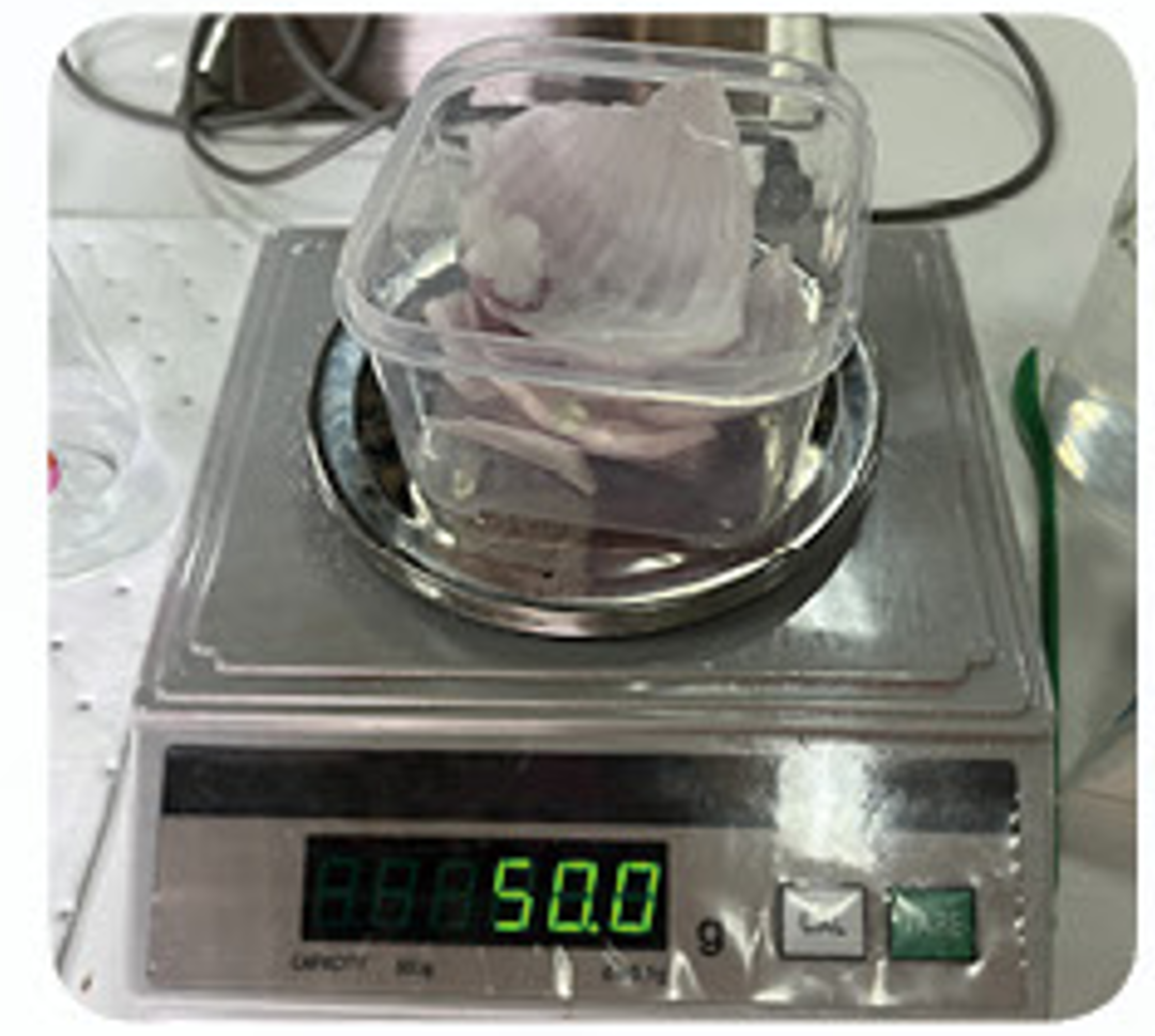 1.用电子秤称取50克新鲜洋葱。这里要注意,不新鲜的洋葱其细胞结构可能已经被破坏了,难以保证DNA的完好性,因此要选取新鲜、有水分的洋葱进行实验。另外,剥洋葱时容易刺激到眼睛,操作时要远离眼睛和口鼻。