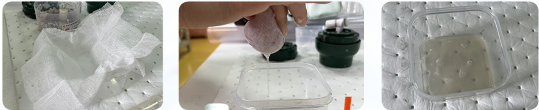 5.在干净的塑料盒中垫上两层纱布。将搅拌成泥的洋葱倒在纱布上。把纱布聚拢后,用手挤一下纱布,洋葱的汁液就会流到塑料盒中。