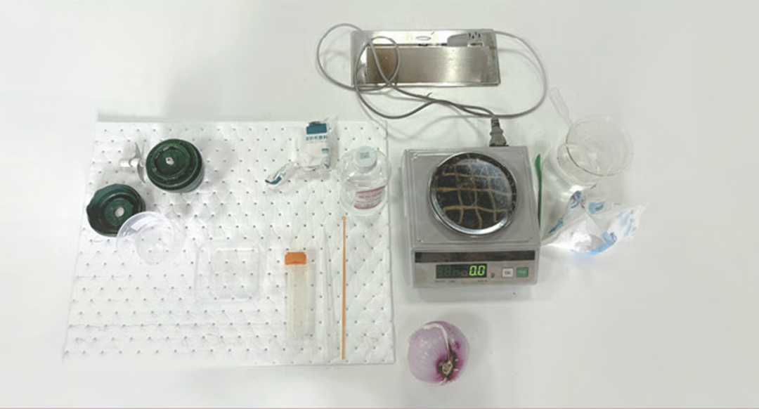 搅拌器、纱布、塑料盒、试管、搅拌棒、酒精、电子秤、小勺、洗涤灵、食用盐、水、洋葱
