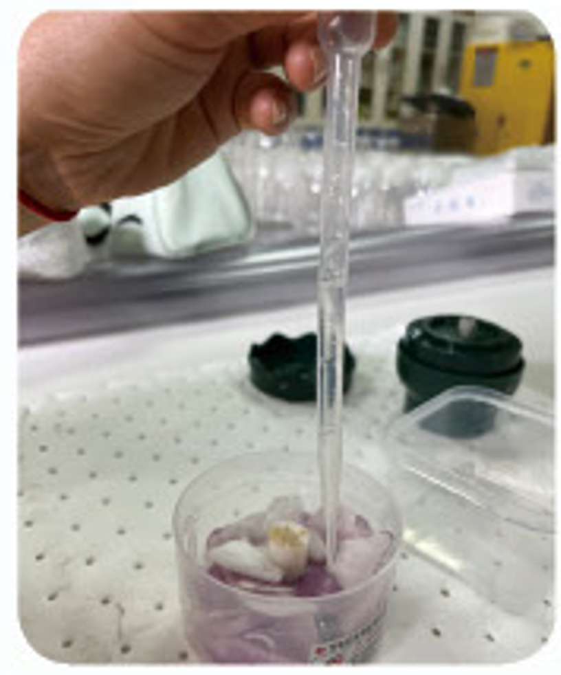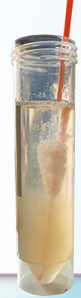 7.用搅拌棒沿一个方向轻轻地搅拌混合溶液,就会看到析出的洋葱DNA。