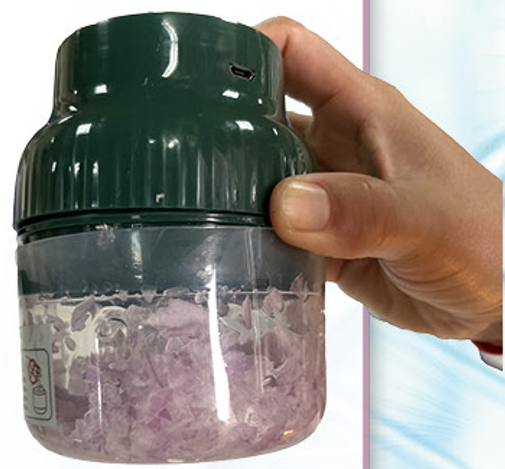 4.用搅拌器将洋葱打碎成泥。如果家里没有搅拌器,可以将洋葱放在容器里用小刀剁碎,但要保证洋葱的汁液没有流失。