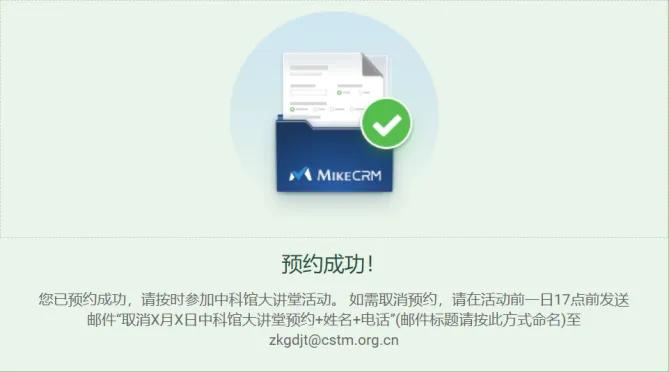 温馨提示:填写并提交后显示下图所示页面,表示您已预约成功,请您按时参加“中科馆大讲堂”活动。